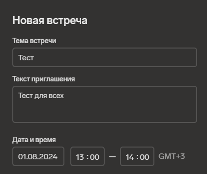 - Тему встречи, текст приглашения, дату и время. Текст приглашения заполняется при необходимости.